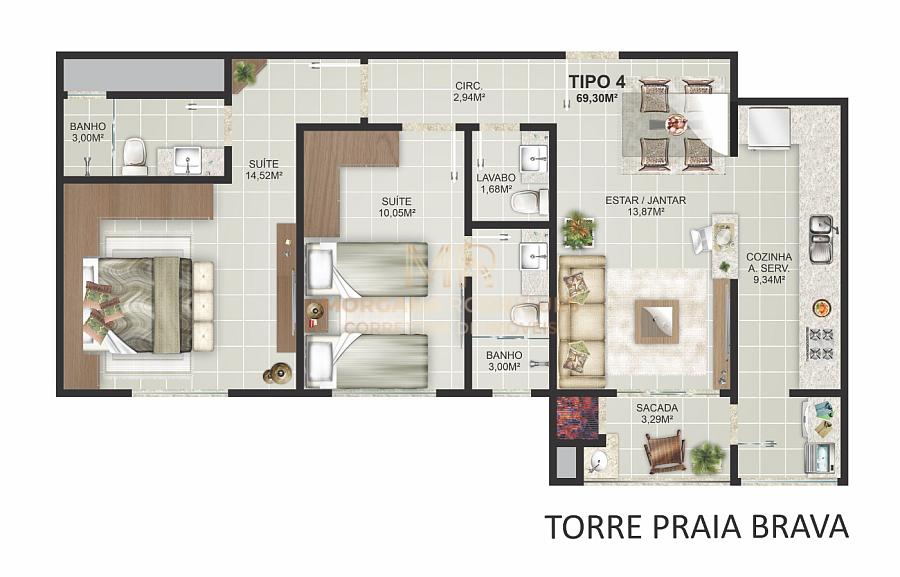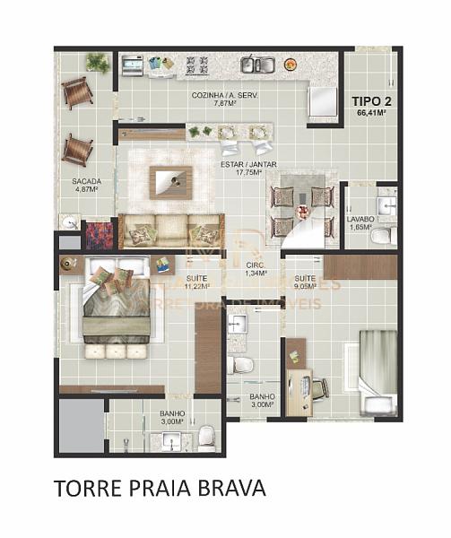 O empreendimento dispõe de 02 torres (Torre Praia Brava e Torre Praia dos Amores) contendo 06 opções de planta cada.